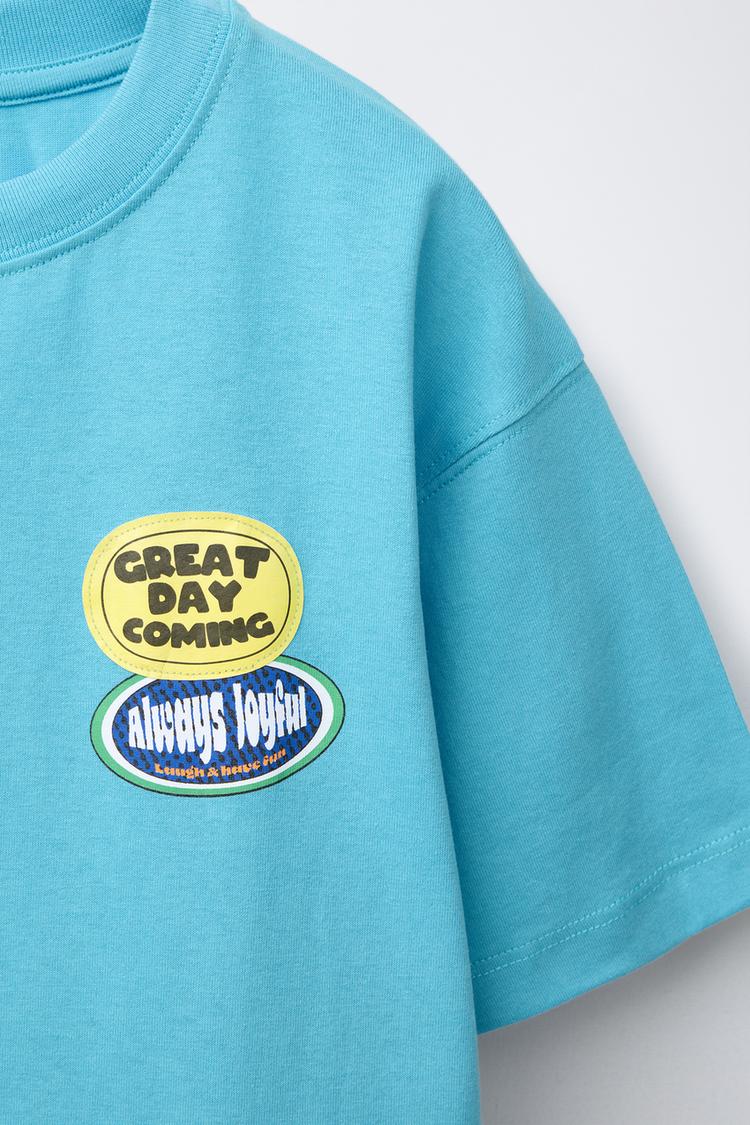 T-shirt with round neck and short sleeves. Print and patch appliqués on the front and back. 100% cotton fabric.