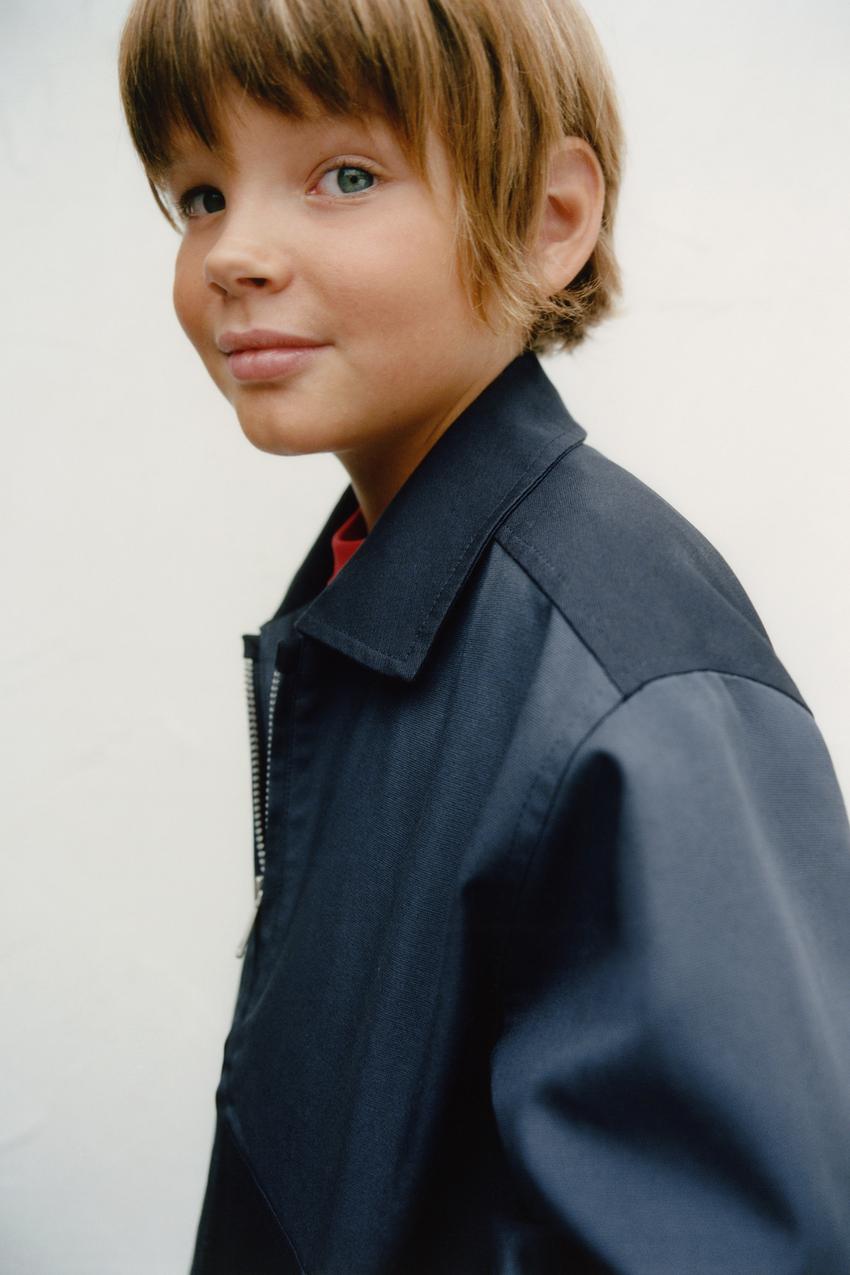 Jacket with shirt collar and long sleeves. Elasticized trim. Front zip closure. Front patch pockets. Label appliqué at back.